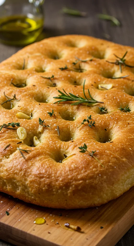 Serve warm with a side of olive oil and balsamic vinegar for dipping. Garnish with extra fresh herbs for a vibrant look. Pair with holiday soups or roasts. This focaccia is great for gifting, wrapped in parchment with a small bottle of olive oil.