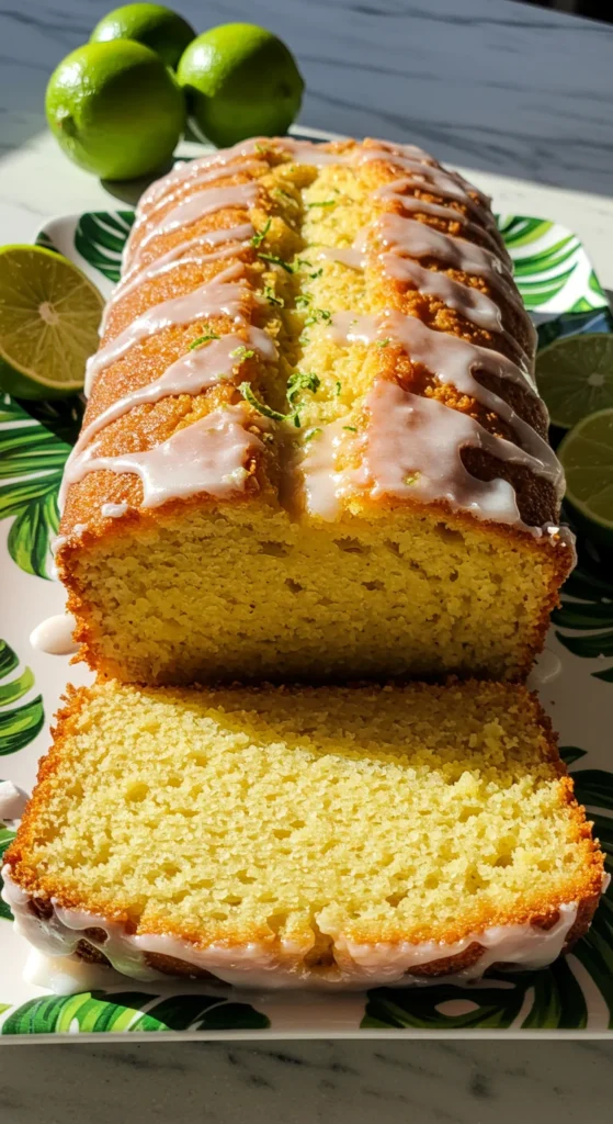 Serve sliced with a sprinkle of toasted coconut for extra crunch. The lime glaze adds a festive shine, perfect for holiday presentations. Pair with a tropical fruit smoothie or tea. This bread is ideal for gifting, wrapped in cellophane with a lime slice garnish.