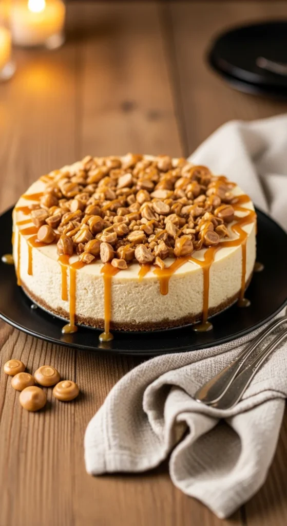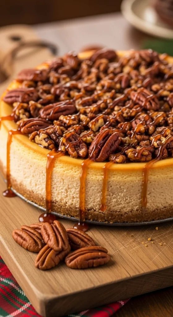 This cheesecake combines the nutty, caramelized flavor of brown butter with crunchy pecans, creating a rich holiday dessert. Its creamy filling and graham cracker crust make it a cozy, indulgent treat for festive gatherings.