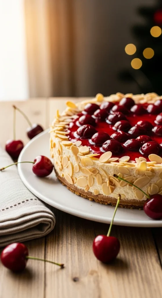 This cheesecake blends the sweet-tart flavor of cherries with the nutty warmth of almonds, creating a sophisticated holiday dessert. Its creamy texture and almond crust make it a perfect balance of flavors for festive gatherings.