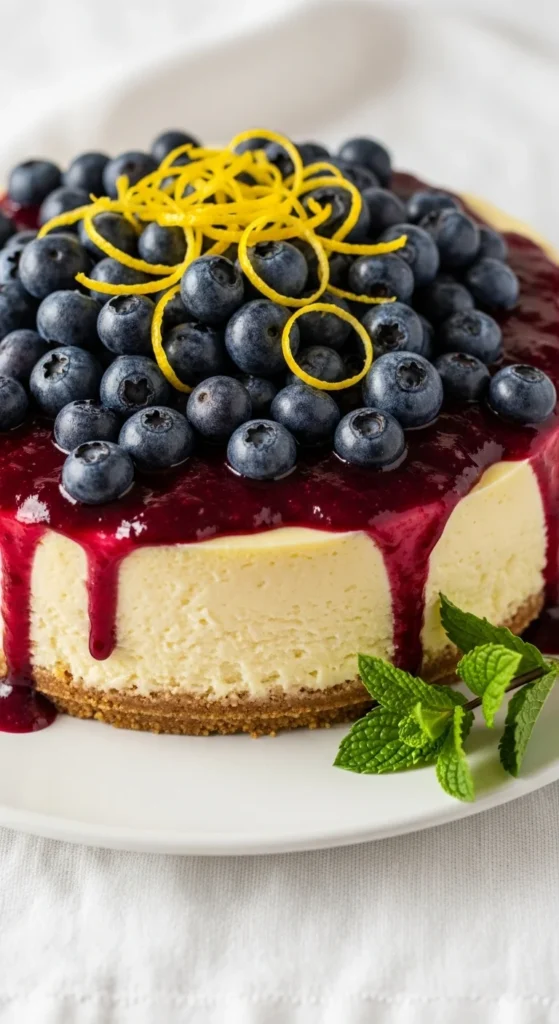 This bright cheesecake blends the tartness of lemon with sweet blueberries, creating a refreshing holiday dessert. Its creamy filling and buttery crust make it a delightful, colorful addition to festive gatherings.