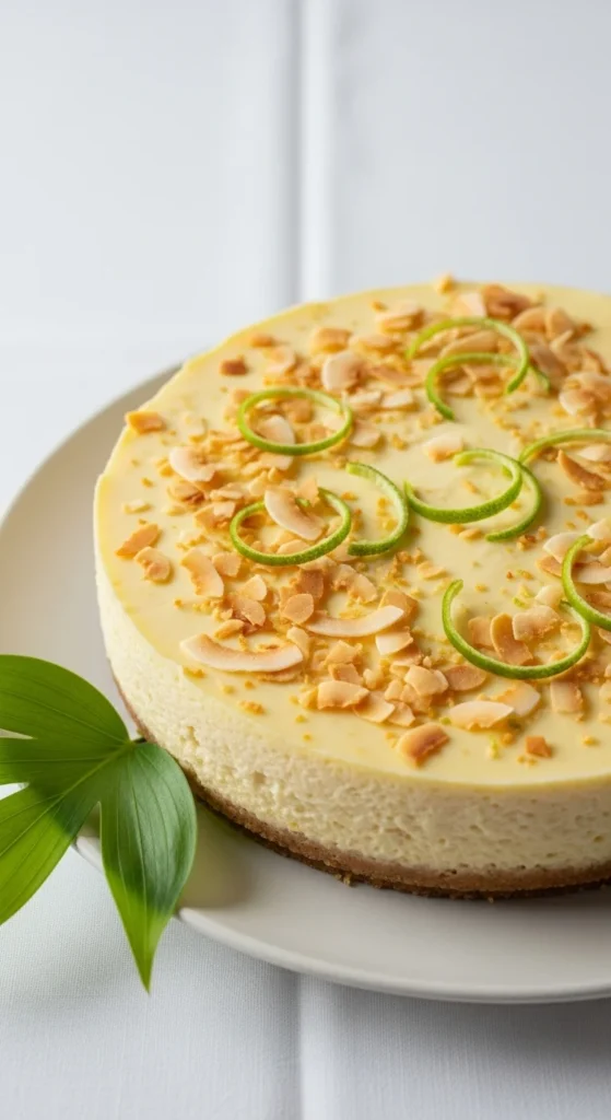 This tropical-inspired cheesecake blends the creamy richness of coconut with the zesty tang of lime, creating a refreshing holiday dessert. Its graham cracker crust and bright flavors make it a unique addition to festive gatherings.