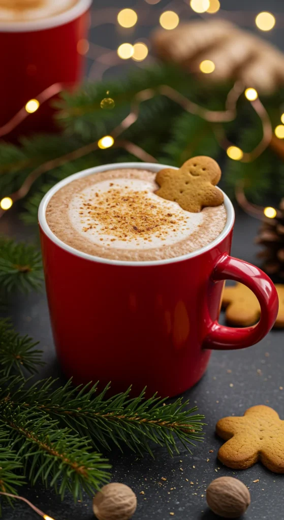 Top with a mini gingerbread cookie and a sprinkle of nutmeg. Serve with gingerbread or sugar cookies for a festive treat. Perfect for holiday parties or cozy Christmas mornings.