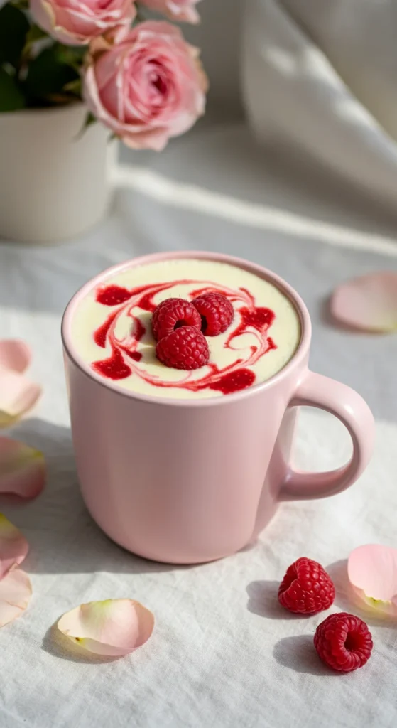 Garnish with fresh raspberries and a drizzle of raspberry coulis. Serve with macarons or shortbread for an elegant touch. This drink is perfect for Valentine’s Day or a cozy winter brunch with friends.