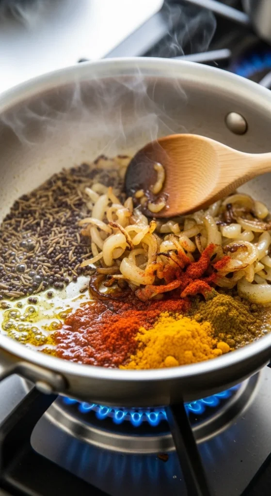 Heat 1 tbsp oil in a medium saucepan over medium heat. Add mustard and cumin seeds; let them sizzle for 30 seconds until they pop and release their aroma. Add onion, garlic, and ginger, sautéing for 3–4 minutes until soft and fragrant. Stir in chili flakes, turmeric, cinnamon, cloves, and salt, cooking for another 30 seconds to bloom the spices.