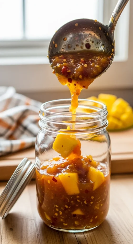 Remove from heat and let the chutney cool slightly. Transfer to clean, sterilized glass jars while still warm. Seal tightly and let cool completely before storing in the fridge. The chutney keeps for up to 1 month in the fridge or can be canned for longer storage. Let it sit for 1–2 days before serving to let the flavors meld.