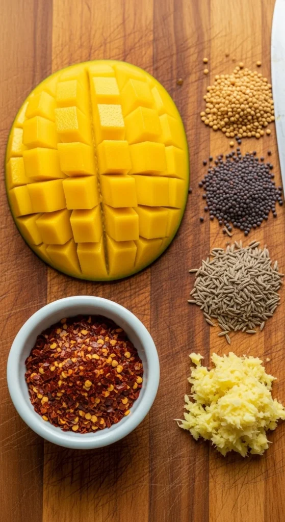 Peel and dice the mangoes into small chunks for a nice texture. Finely chop the onion, mince the garlic, and grate the ginger. Measure out your spices—mustard seeds, cumin seeds, chili flakes, turmeric, cinnamon, and cloves—to have them ready. This prep makes cooking smooth and quick.