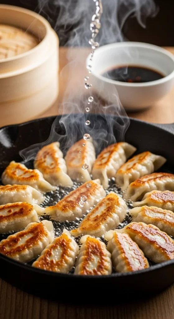- Pan-fried (potstickers): Heat 1 tbsp oil in a non-stick skillet over medium-high heat. Add dumplings, flat-side down, and cook for 2–3 minutes until golden. Add 1/4 cup water, cover, and steam for 5–6 minutes until cooked through. Uncover and crisp the bottoms for 1–2 minutes.