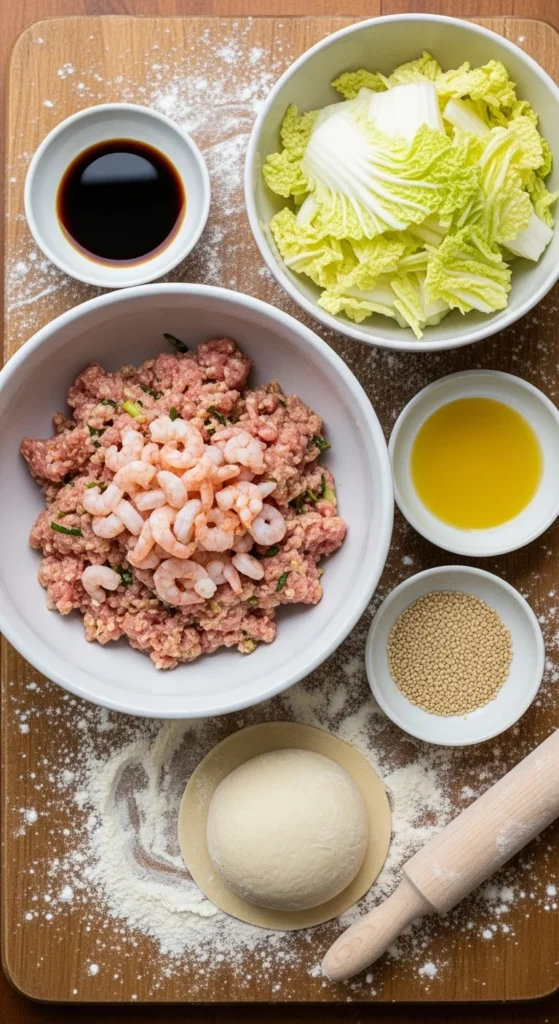 - For the filling: 1/2 lb ground pork, 1/4 lb shrimp (peeled, deveined, finely chopped), 1 cup napa cabbage (finely chopped), 2 tbsp soy sauce, 1 tbsp sesame oil, 1 tsp grated ginger, 2 garlic cloves (minced), 2 scallions (finely chopped), 1 tsp cornstarch, 1/2 tsp white pepper, 1 tsp sugar.