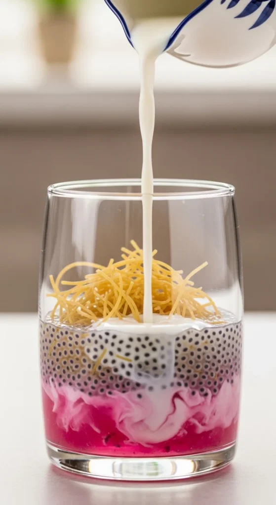Falooda is all about layering, so prep is key. Start by soaking the basil seeds in water—they’ll swell up into tiny, tapioca-like pearls in about 30 minutes. Cook the falooda vermicelli according to the package instructions (usually a quick boil for 5–7 minutes), then rinse under cold water to stop the cooking process. Keep the milk chilled in the fridge until you’re ready to assemble—this keeps your falooda refreshing.