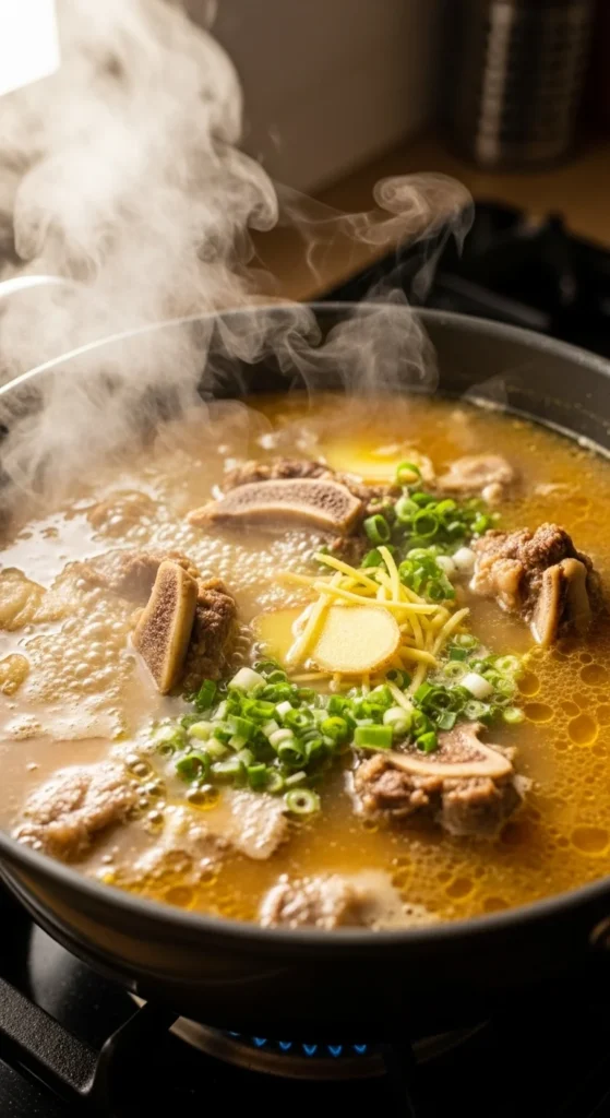 Add the blanched bones to a clean pot with 4–5 quarts of fresh water. Bring to a boil, then reduce to a low simmer. Add onion, garlic, ginger, green onions, shiitake mushrooms, and kombu. Simmer gently for 8–12 hours, stirring occasionally and skimming foam as needed. Keep the water level consistent by adding more if it reduces too much.