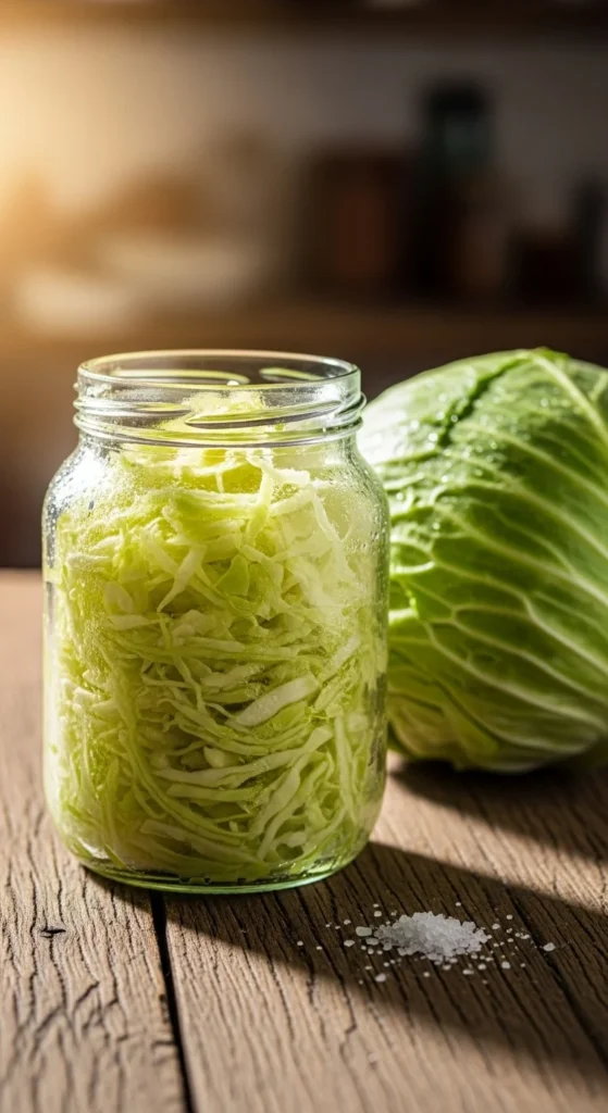 Place a weight (like a small glass or a clean stone) on top of the cabbage to keep it submerged. Cover the jar with a clean cloth or a loose lid to allow gases to escape while keeping dust out. Store it at room temperature (65–75°F) away from direct sunlight.