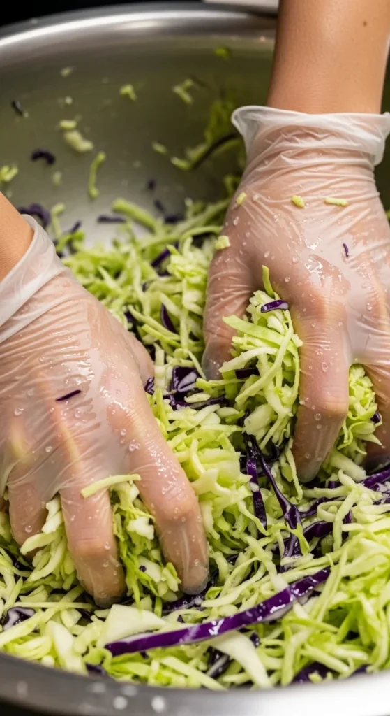 Now comes the fun part—massaging! Use clean hands to knead and squeeze the cabbage for 5–10 minutes. You’ll notice it softening and releasing liquid. This natural brine is key to fermentation, so keep going until the cabbage feels wet and limp.
