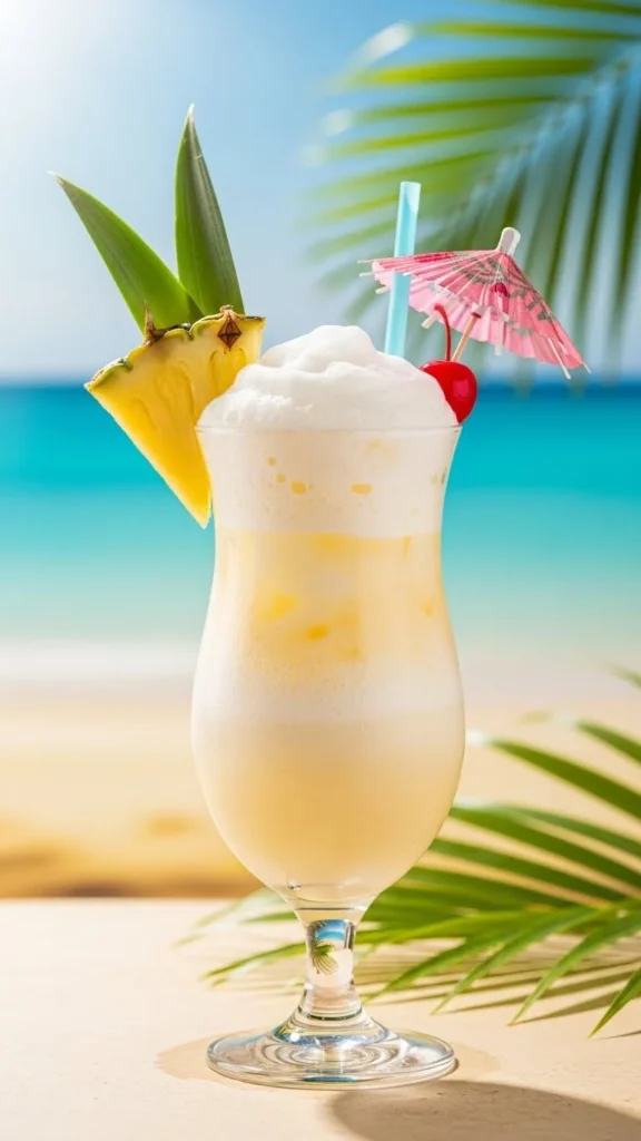Top with toasted coconut flakes or pineapple slices. Serve in curved glasses. Great for themed parties.
