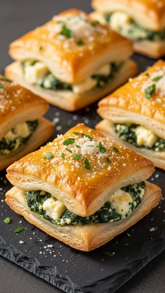 These bite-sized pastries are buttery, crisp, and filled with a rich spinach and cheese center that feels festive without being heavy. They bake quickly, hold their shape well, and are easy to prep ahead for busy party nights. Guests love their flaky texture and savory filling, making them perfect for grazing throughout the evening. They disappear fast, so making an extra batch is always a smart move.