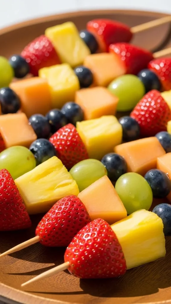These skewers are fresh, juicy, and refreshing. They balance heavier foods nicely. Easy to prep ahead. Bright and cheerful.