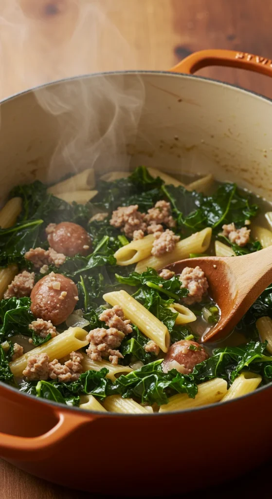 This sausage and kale pasta is a nutrient-packed winner. Brown sausage, add kale, garlic, pasta, and broth. Simmer 12 minutes. Save money by using store-brand sausage. One pot keeps cleanup simple. A basic pot works fine—no need for specialty cookware. Add red pepper flakes for a kick. Serves five and reheats well. Chop kale ahead to save time. It’s a hearty, healthy meal that leaves minimal dishes for busy nights.