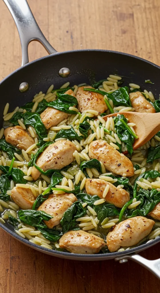 This chicken and spinach orzo is healthy and fast. Brown chicken, add orzo, broth, and spinach. Simmer 12 minutes. Save money by using frozen spinach. One pot keeps cleanup easy. A basic pan works fine—no specialty cookware needed. Add garlic for flavor. Serves four and reheats well. Prep ingredients ahead to save time. It’s a light, nutritious meal that leaves just one pot to wash.