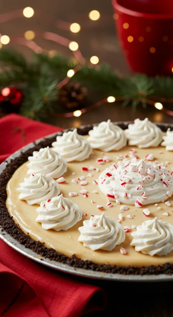 Slice and serve chilled on festive plates for a stunning presentation. Garnish with a sprinkle of candy cane pieces or a drizzle of chocolate sauce. Pair with hot cocoa or coffee for a cozy treat. This pie is perfect for Christmas potlucks or family dinners.