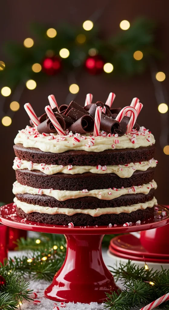 Slice and serve on festive plates for a dramatic presentation. Garnish with chocolate curls or extra candy cane pieces. Pair with coffee or a glass of milk for a classic pairing. This cake is perfect for Christmas Eve or holiday celebrations.