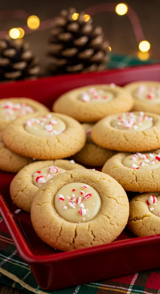 These buttery thumbprint cookies are filled with creamy white chocolate and topped with a sprinkle of candy canes, making them a festive and flavorful treat for holiday cookie plates. Their classic look and minty twist are a hit.