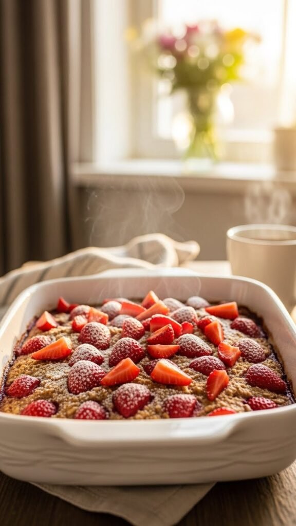 This baked French toast is rich, soft in the center, and lightly crisp on top, making it perfect for sharing. The cream cheese melts into the bread as it bakes, creating pockets of sweetness. Fresh strawberries add color and freshness that fit a Valentine’s table. It’s a make-ahead option that keeps brunch relaxed. Each bite feels comforting yet festive. Ideal for serving warm straight from the oven.