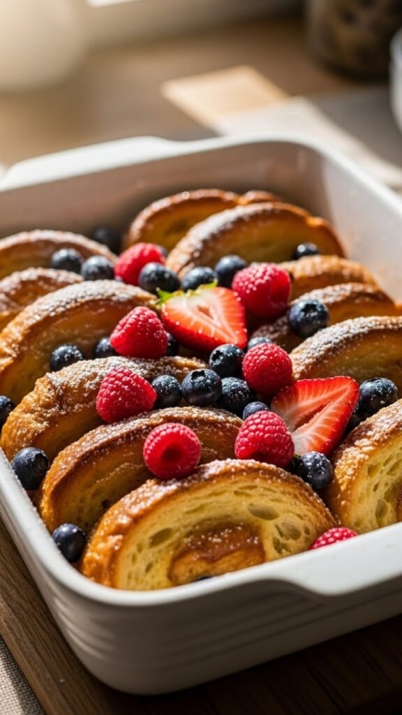 Croissants make this dish buttery and soft. Baked style keeps it easy. Berries add contrast. Perfect for sharing. Smells amazing.