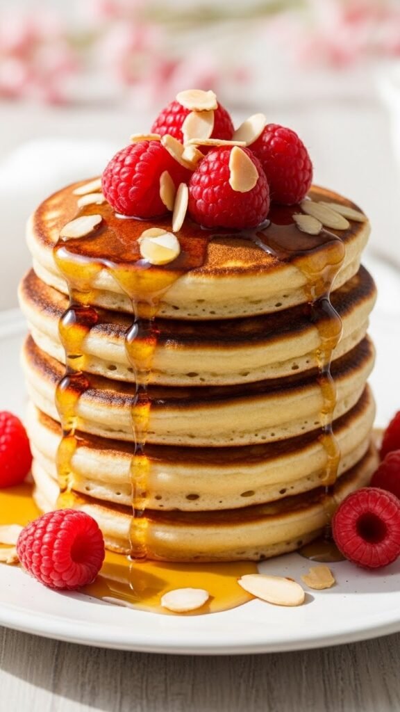 These pancakes are light, tender, and gently nutty from almond flour. Raspberries burst slightly as they cook, adding tart contrast. The color feels perfect for Valentine’s brunch. They cook quickly, making them great for small gatherings. Each stack looks inviting on the table.