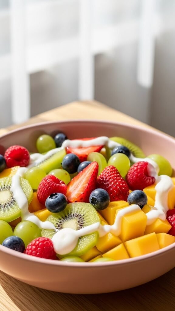 This salad is fresh and light. Honey yogurt ties fruit together. Simple and refreshing. Balances richer dishes. Great chilled.