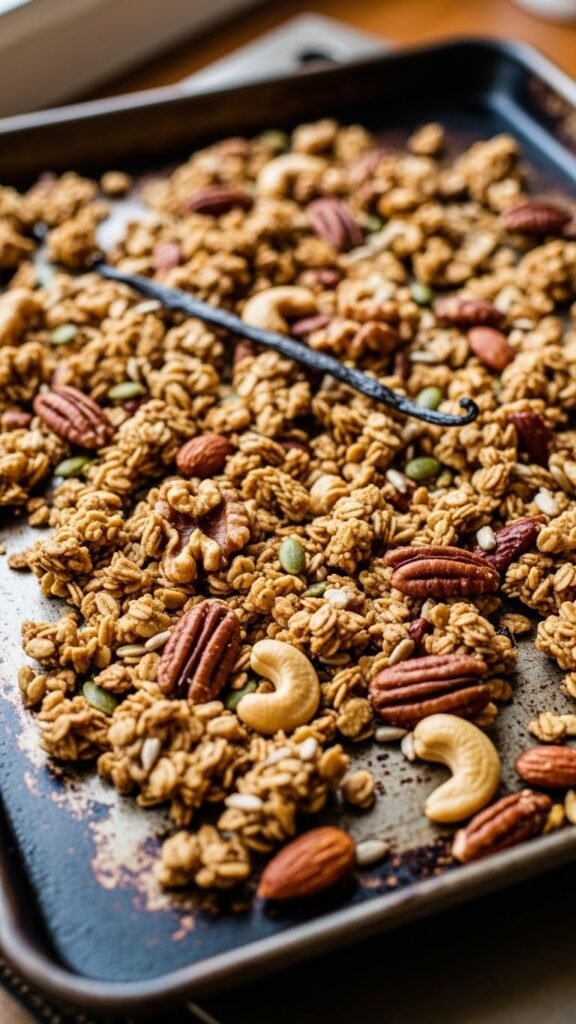 This granola is crunchy and fragrant. Almonds add texture. Vanilla aroma fills the kitchen. Easy to store. Great topping.