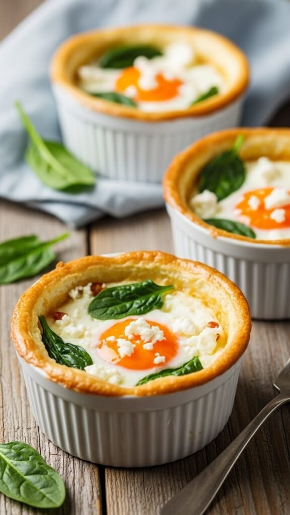 These baked eggs feel comforting and savory. Spinach adds freshness while feta brings saltiness. They’re simple yet satisfying. Perfect for balancing sweet dishes. Individual ramekins make serving easy.