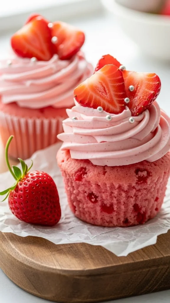 These cupcakes are light, fruity, and cheerful. The strawberry flavor feels fresh and sweet. Perfect for Valentine’s parties. Easy to decorate.