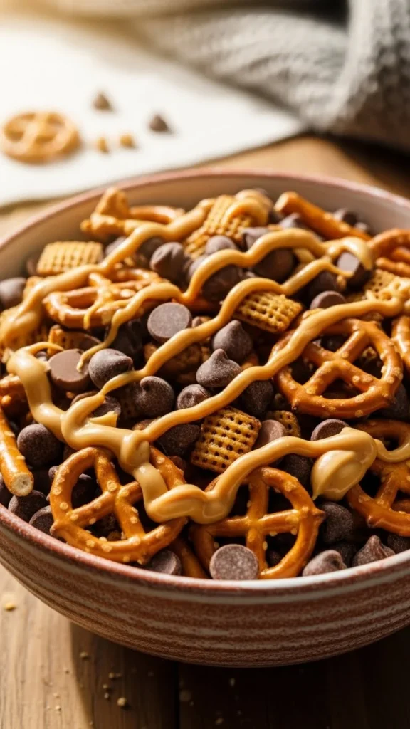This snack mix combines sweet, salty, and crunchy elements that feel impossible to stop eating. Peanut butter adds richness while chocolate keeps it indulgent. It’s easy to toss together in minutes. Great for long conversations or games. Each handful feels balanced. Perfect for sharing between two.