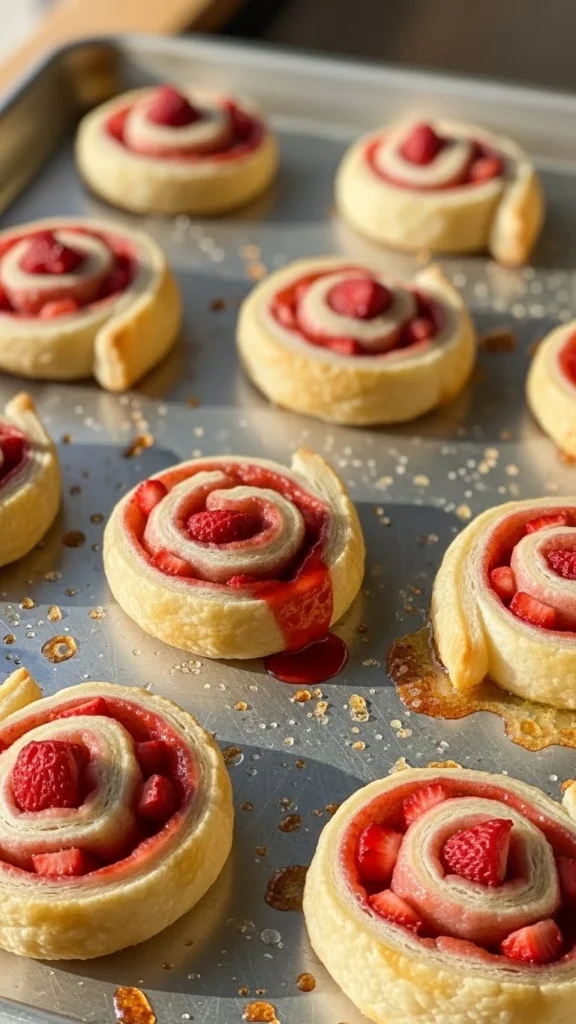 These pinwheels are flaky, creamy, and lightly sweet with strawberry flavor throughout. Puff pastry keeps them crisp. They’re easy to slice and bake. Great finger food. Perfect for grazing. Each swirl looks festive.