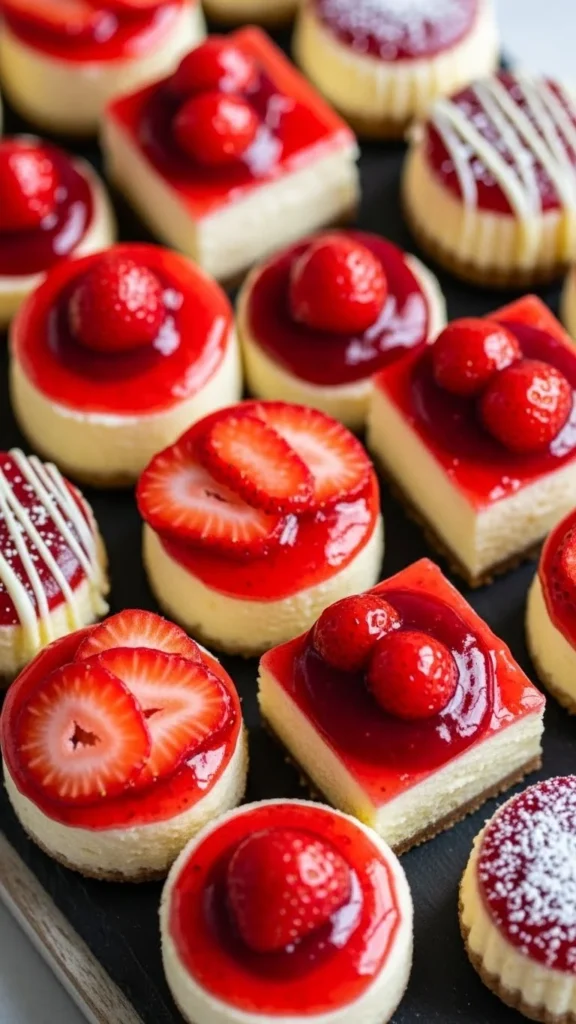 These bites feel creamy and rich. Strawberry topping adds freshness. Small portions work well. Easy to serve. Valentine-ready dessert.