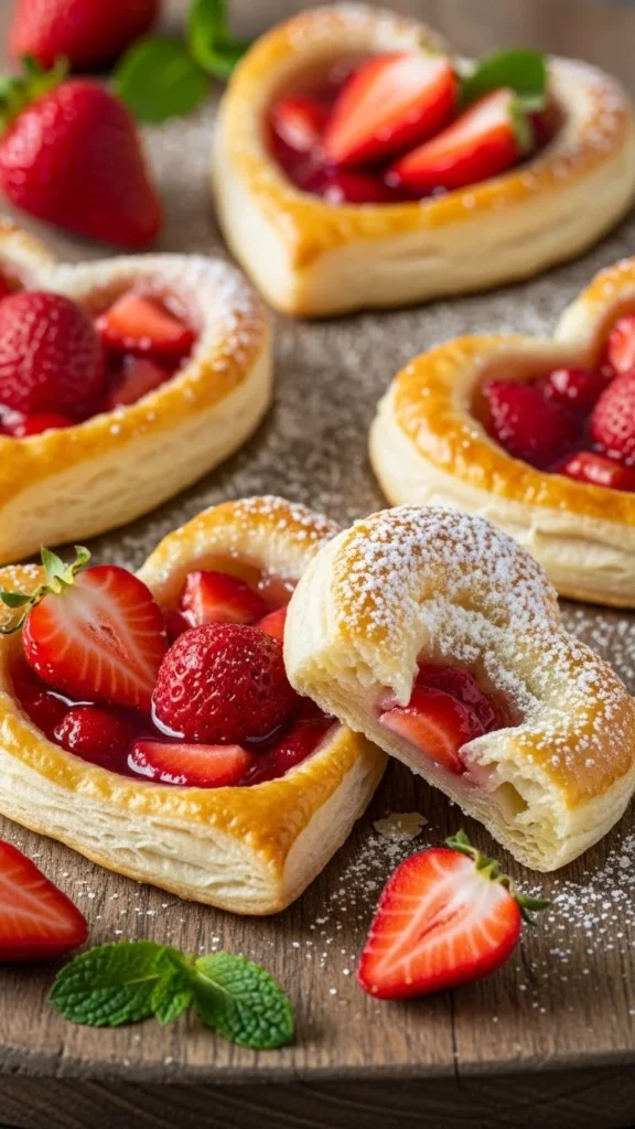 These pastries feel light and flaky. Strawberry filling adds sweetness. Heart shapes look festive. Simple ingredients. Bakery-style treat.