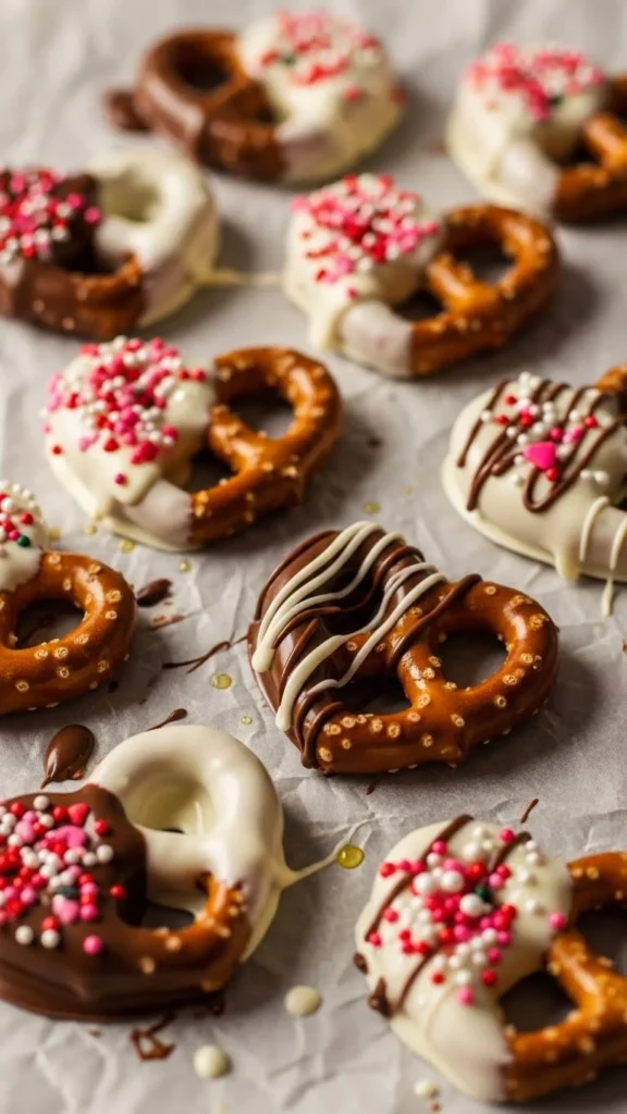 These treats mix sweet and salty flavors in a fun way. Crunchy pretzels contrast with smooth chocolate. Heart shapes feel playful and festive. No baking required. Great for quick Valentine snacks.