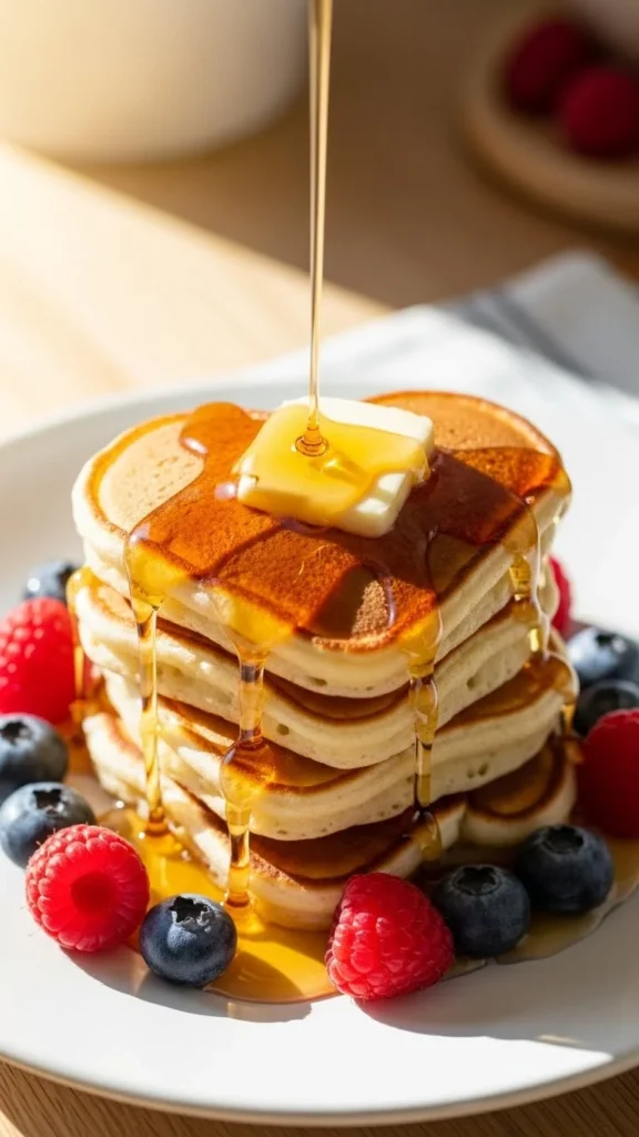 Drizzle syrup or honey. Add berries. Serve fresh. Stack on plates. Fun breakfast treat.